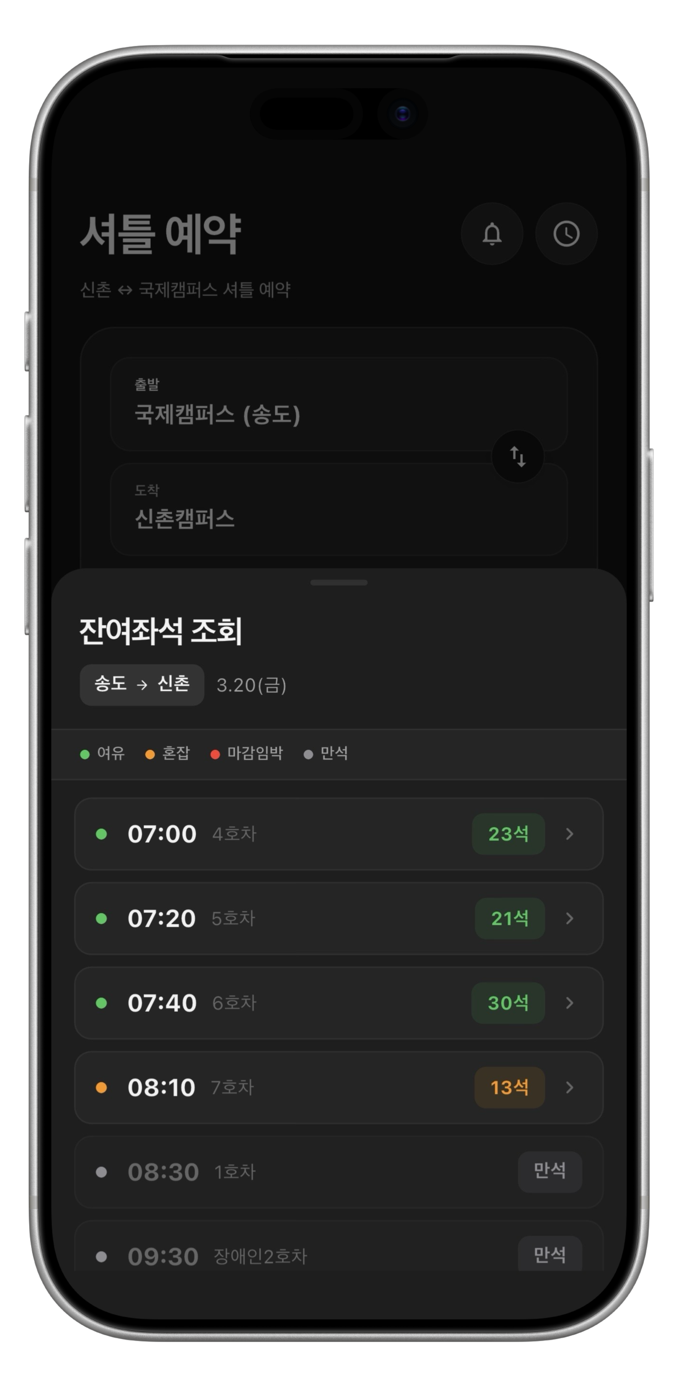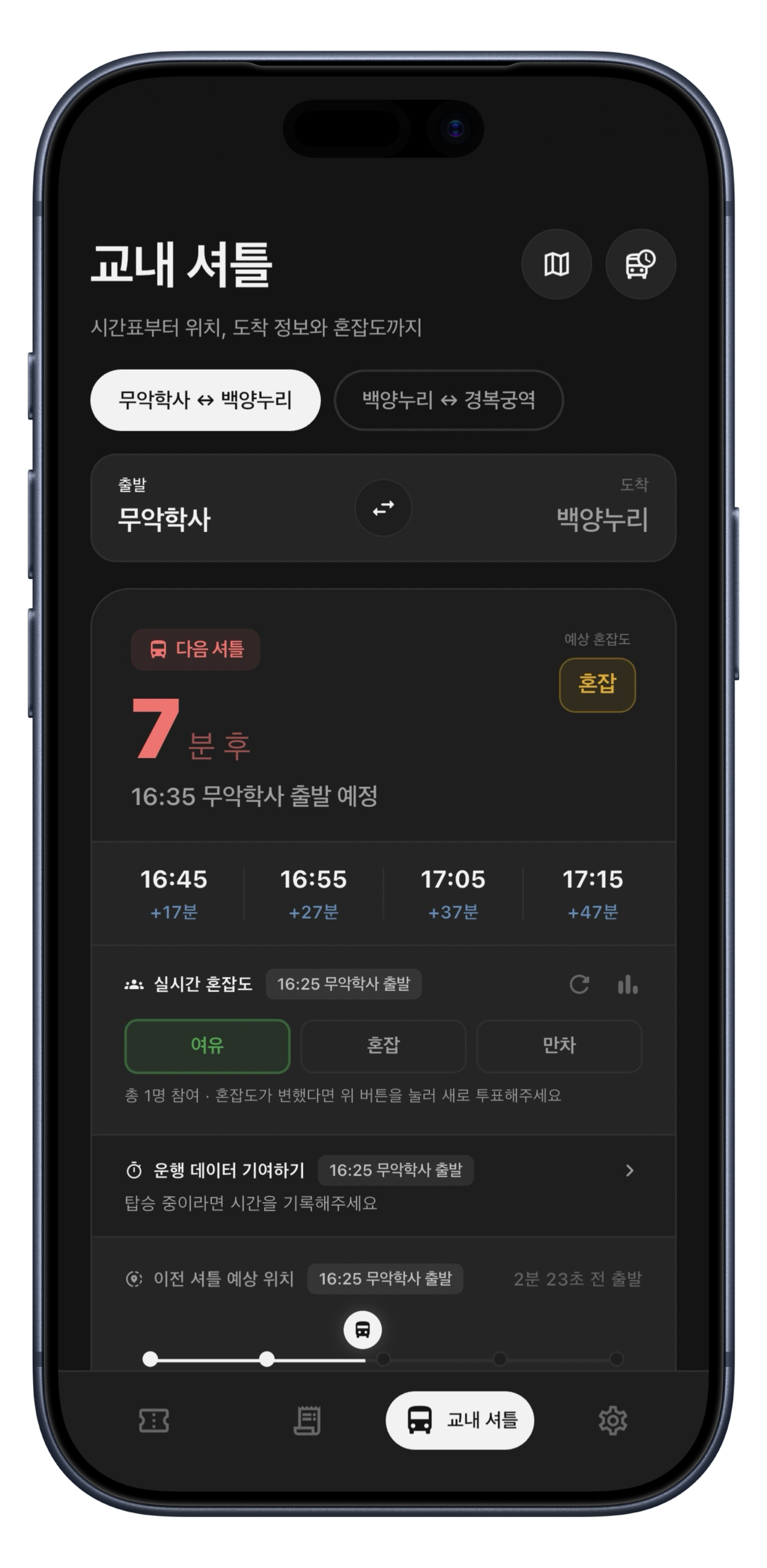 다음 셔틀까지 남은 시간과 실시간 혼잡도 및 예상 위치를 실시간으로 확인하세요.