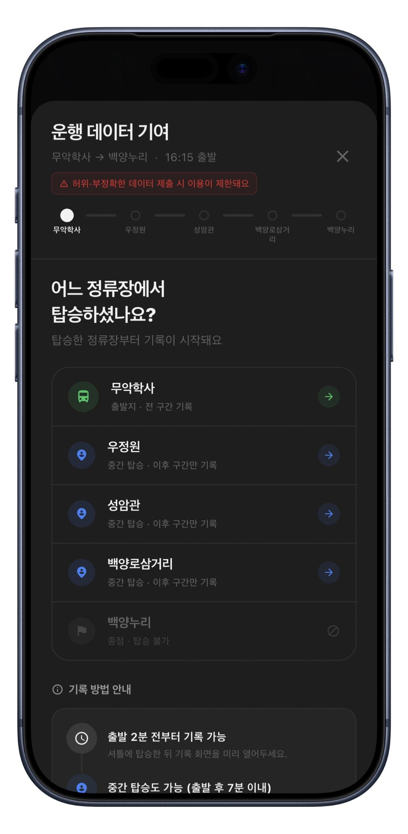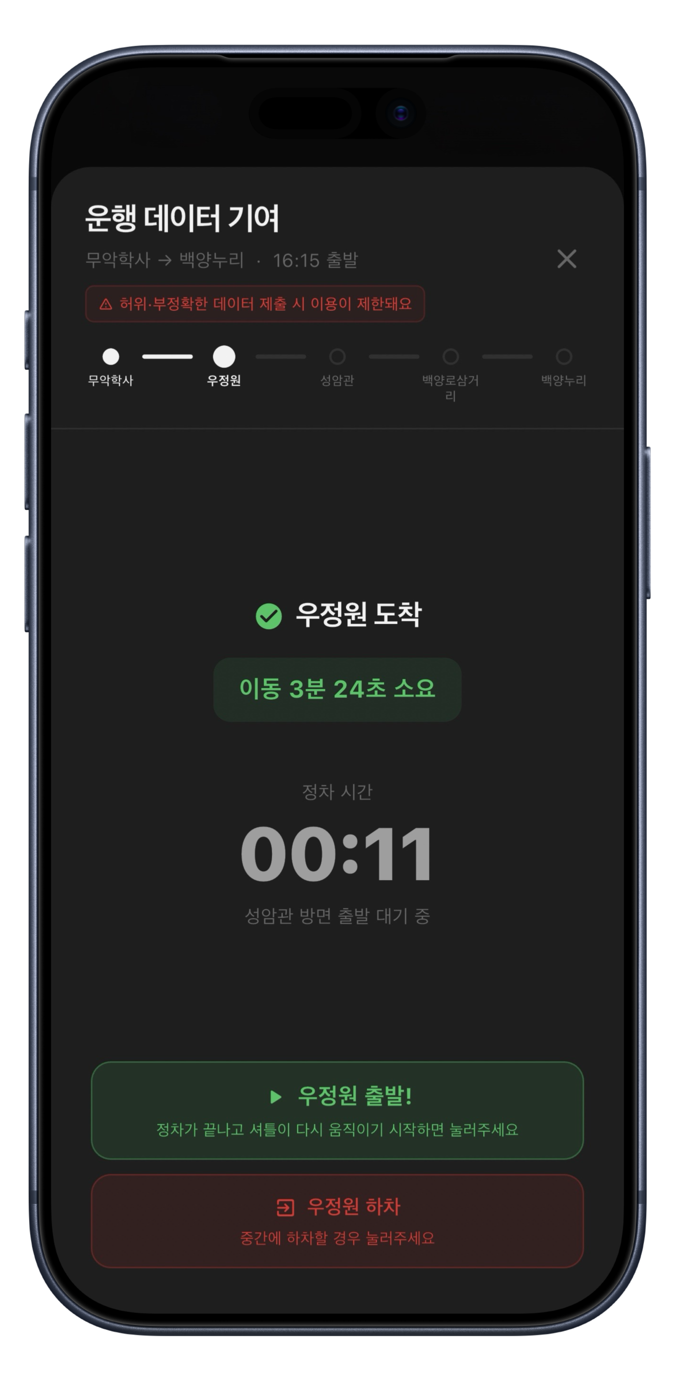 직접 탑승한 정류장에서 정류장별 이동 시간을 측정해서 기여하면 실시간 예상 위치 정밀도가 높아져요.