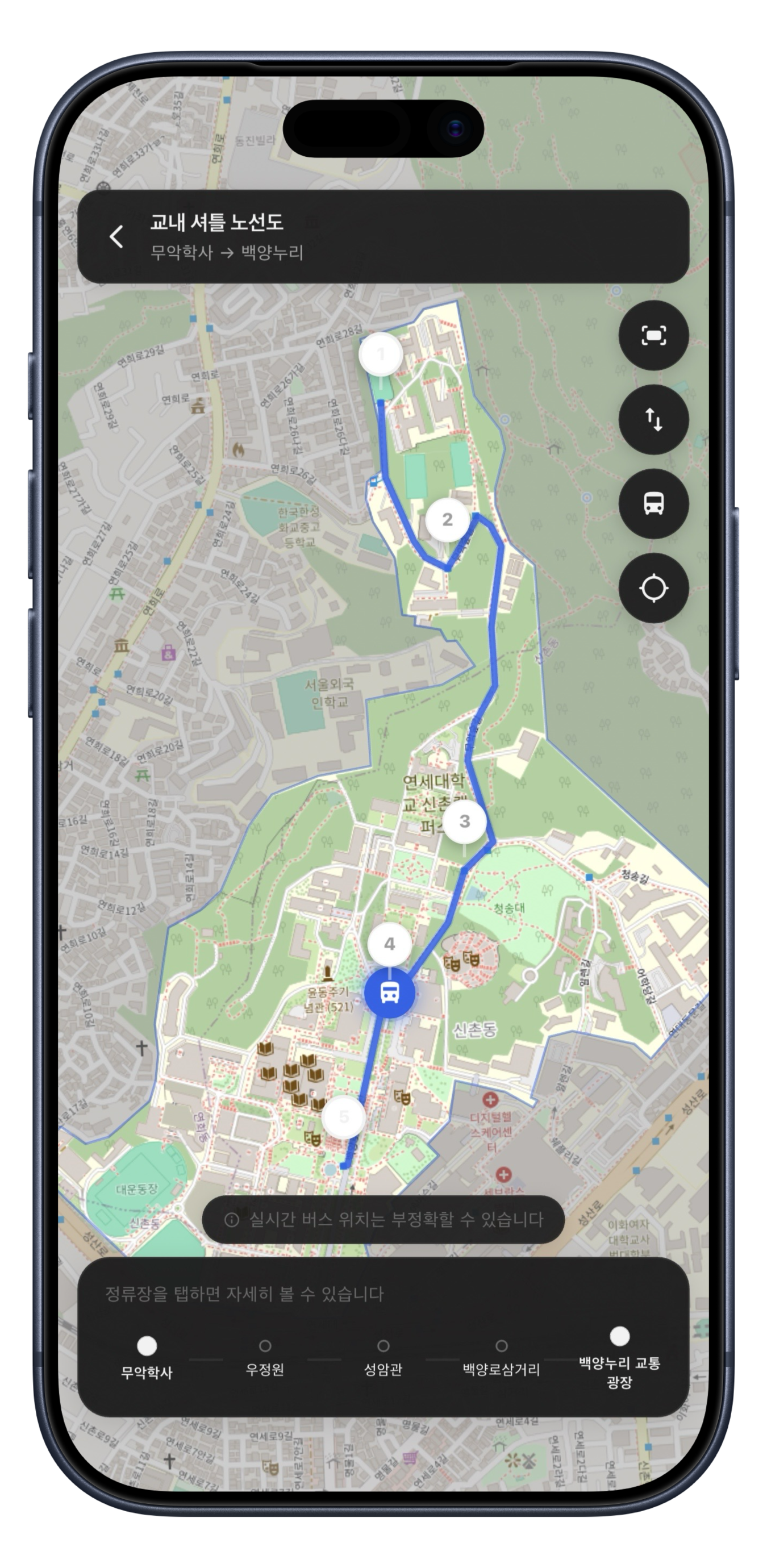 교내 셔틀 경로와 정류장 위치를 지도에서 직접 확인하세요. 처음 이용하는 학생들도 헷갈리지 않아요.