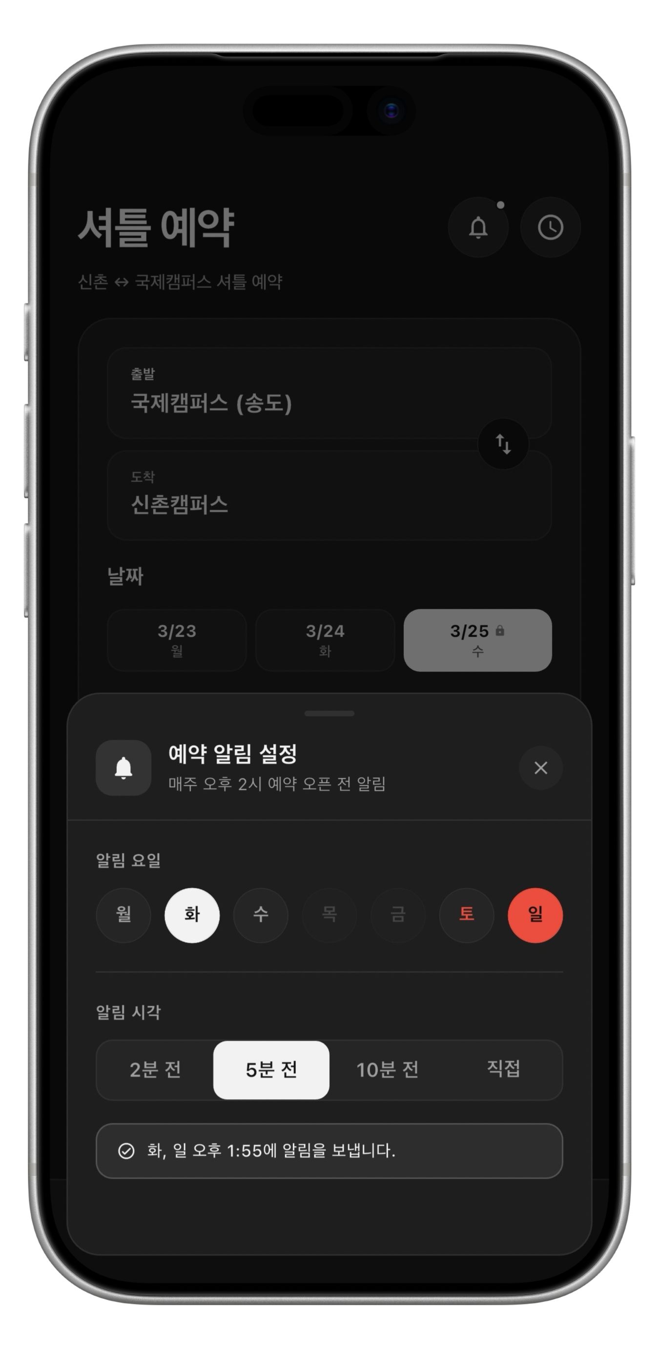 예약 오픈 시간 알림으로 소중한 셔틀 예약을 놓치지 마세요.